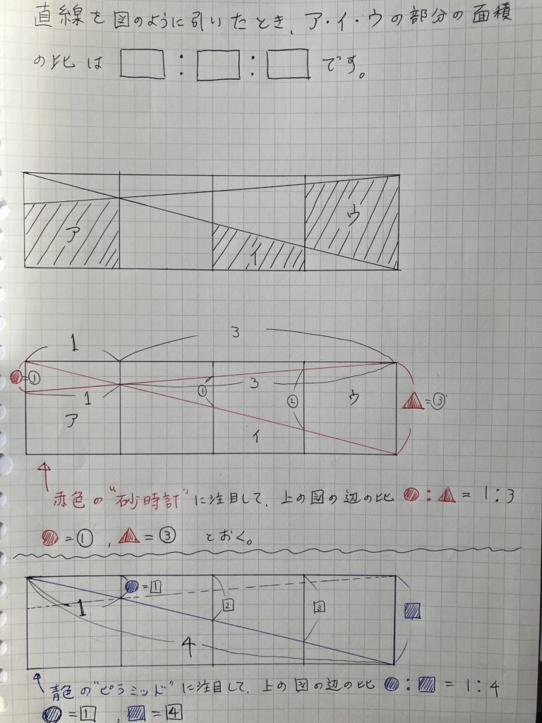 上の図を見ながら、実際に解いてみてほしいのですが、赤色の「砂時計」、青色の「ピラミッド」に注目して、まずはそれらの三角形の「対応する辺の比」を考えてみましょう。